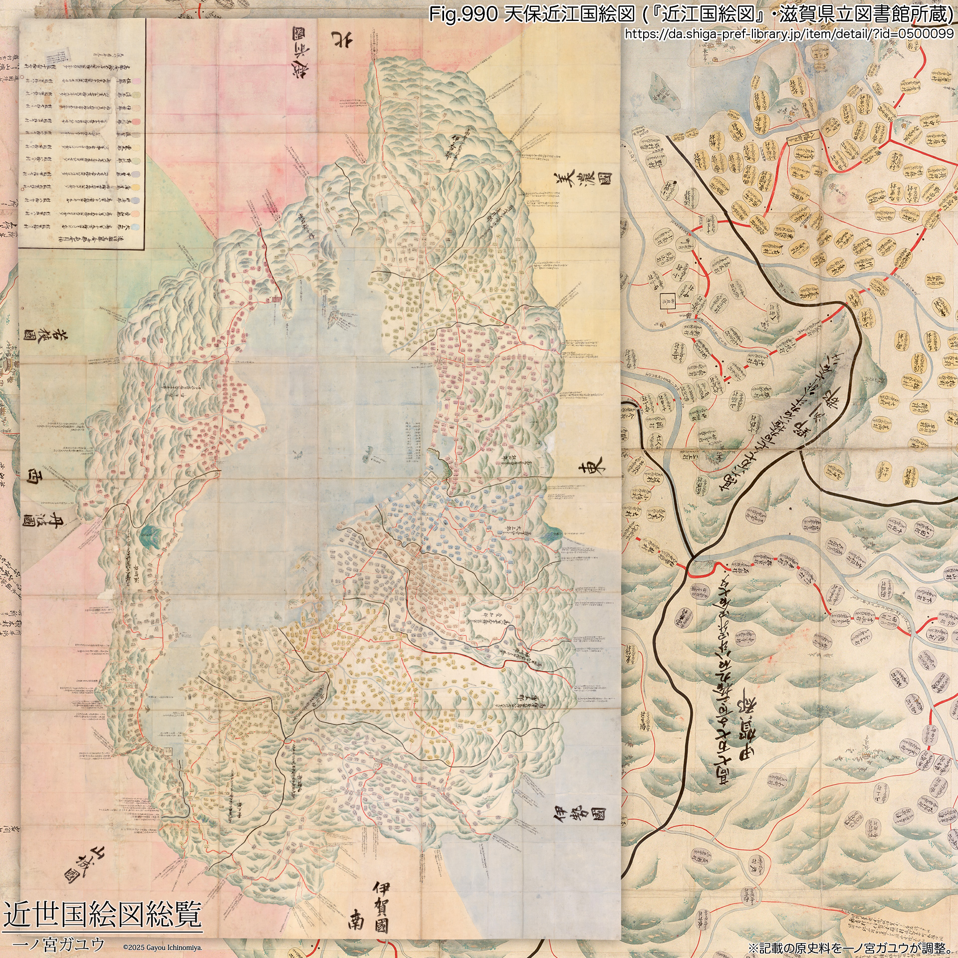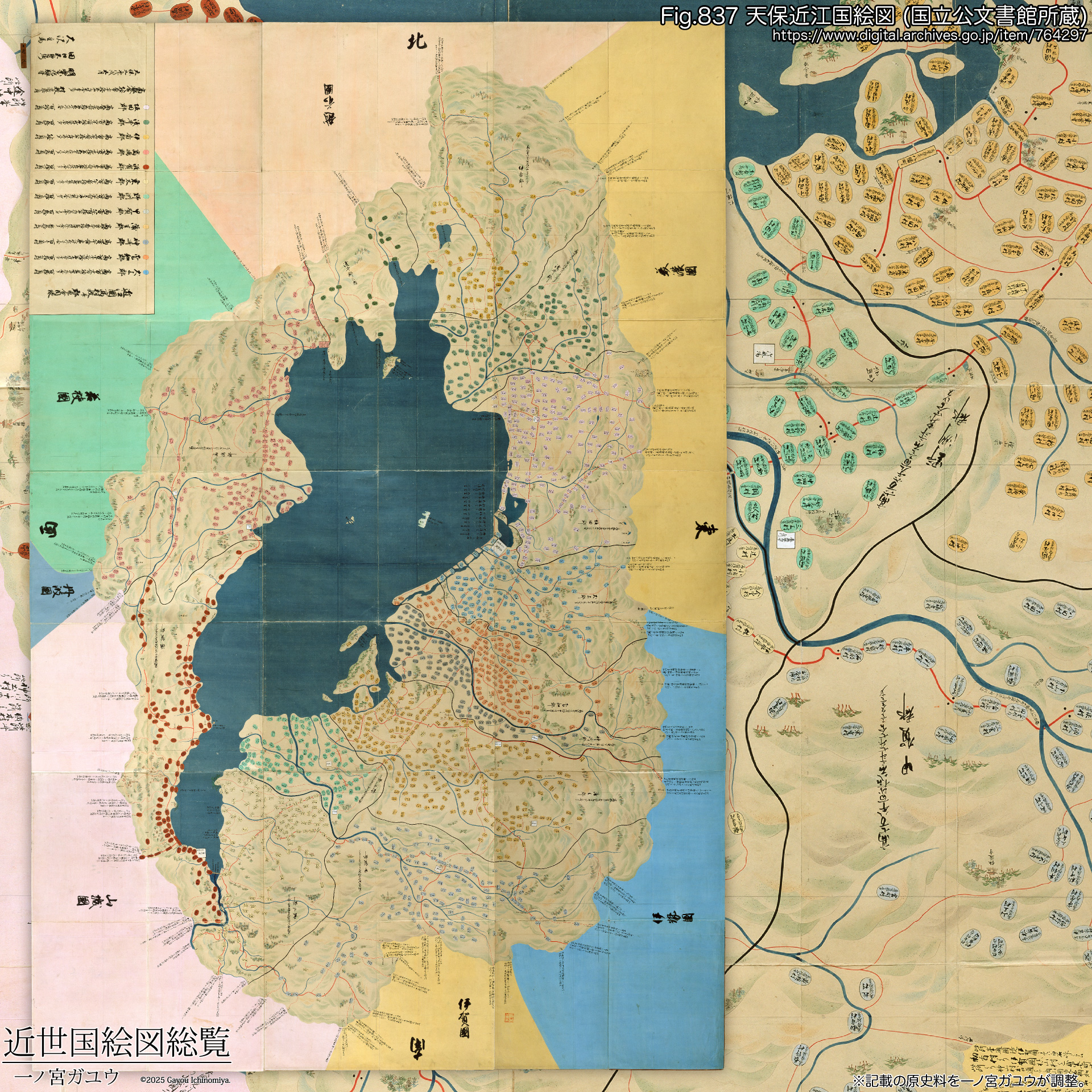 冒頭で言及のとおり、『天保近江国絵図』は国立公文書館に紅葉山文庫旧蔵 (#764297) が現存・オンライン公開されている。
