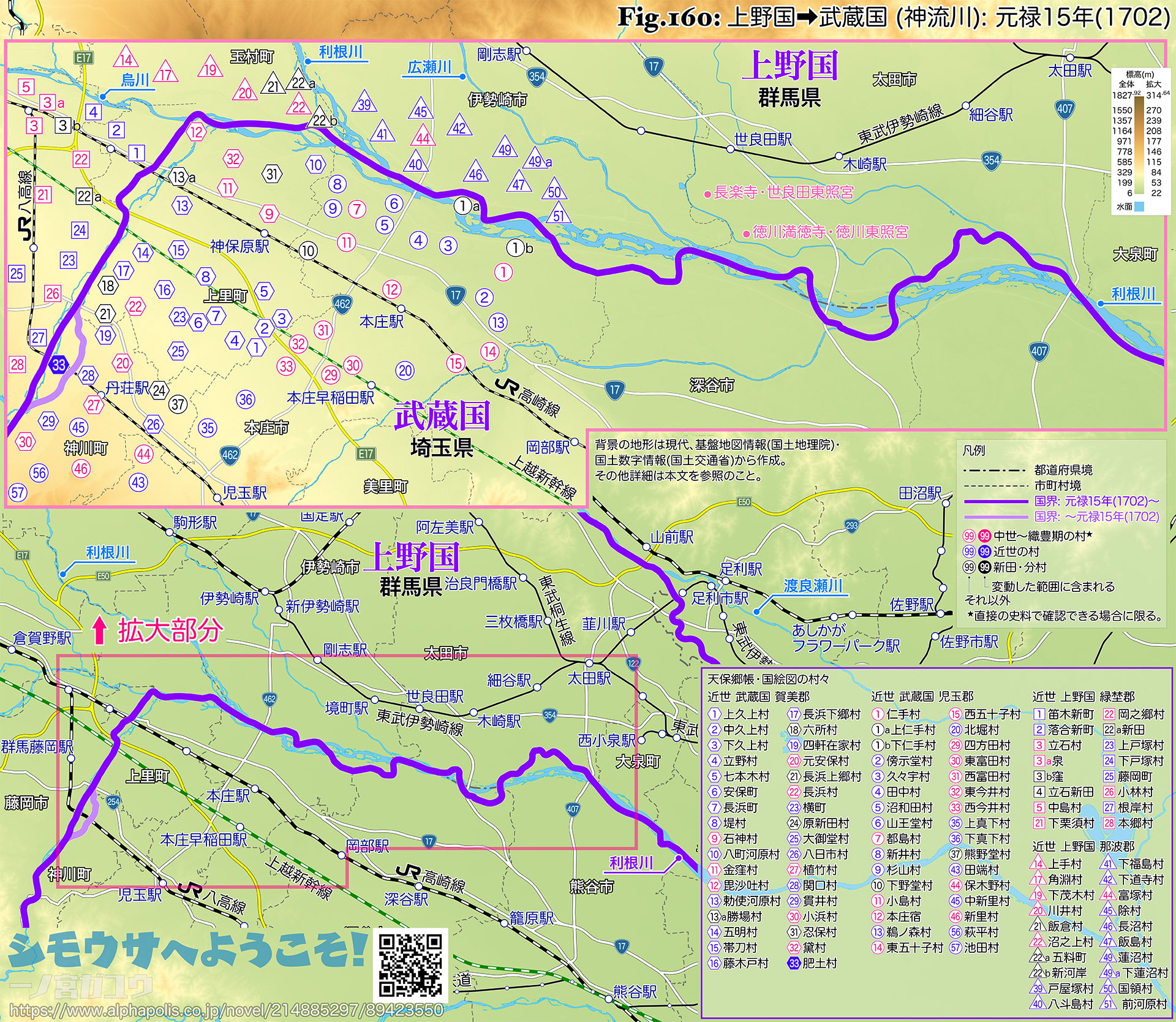 | ❉26: | 上野国の寛文郷帳・中川忠英旧蔵 上野国絵図に含まれ、武蔵田園簿・正保年中改定図には含まれない。一方、武蔵国の元禄郷帳・元禄年中改定図・天保郷帳・国絵図に含まれ、上野国の天保郷帳・国絵図には含まれない。 |