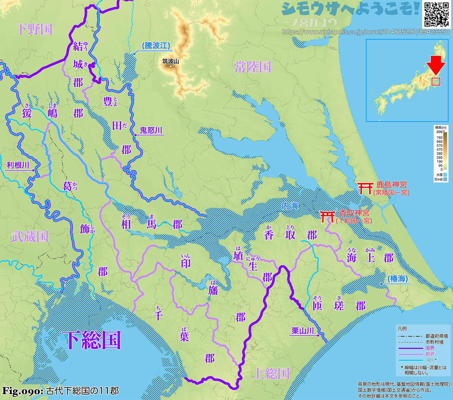 古代下総国の下に置かれた郡(コホリ/コオリ/グン)は、葛飾・千葉・印旛・匝瑳・海上・香取・埴生・相馬・猨嶋・結城・豊田の11郡である。それぞれの範囲は概ね以下のようだったと考えられている。