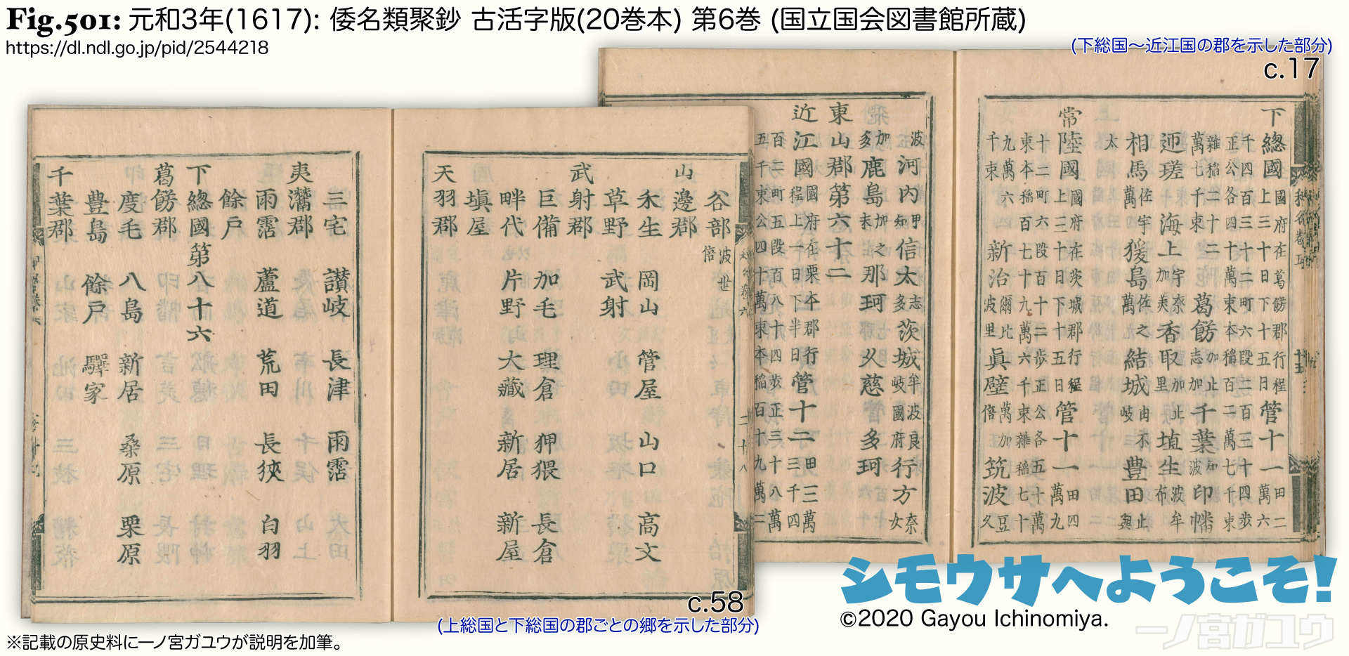 10巻本と20巻本の 2系統があるが、このうち 20巻本には国郡郷の一覧が含まれ、古代の地名を検討するのに欠かせない。本稿で和名類聚抄という場合も 20巻本のほうを指し、NDLDC#2606770 (2544216〜2544225) を参照した。