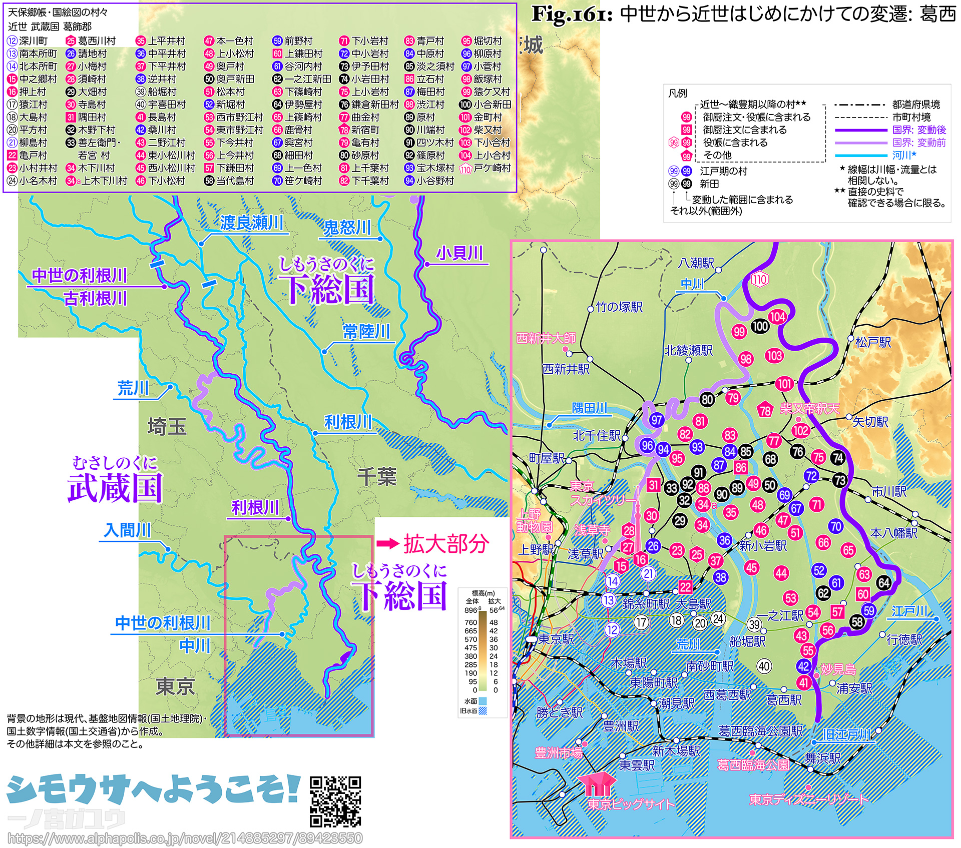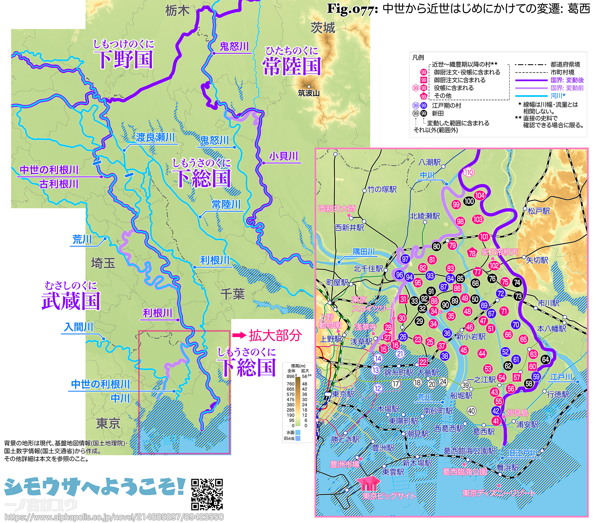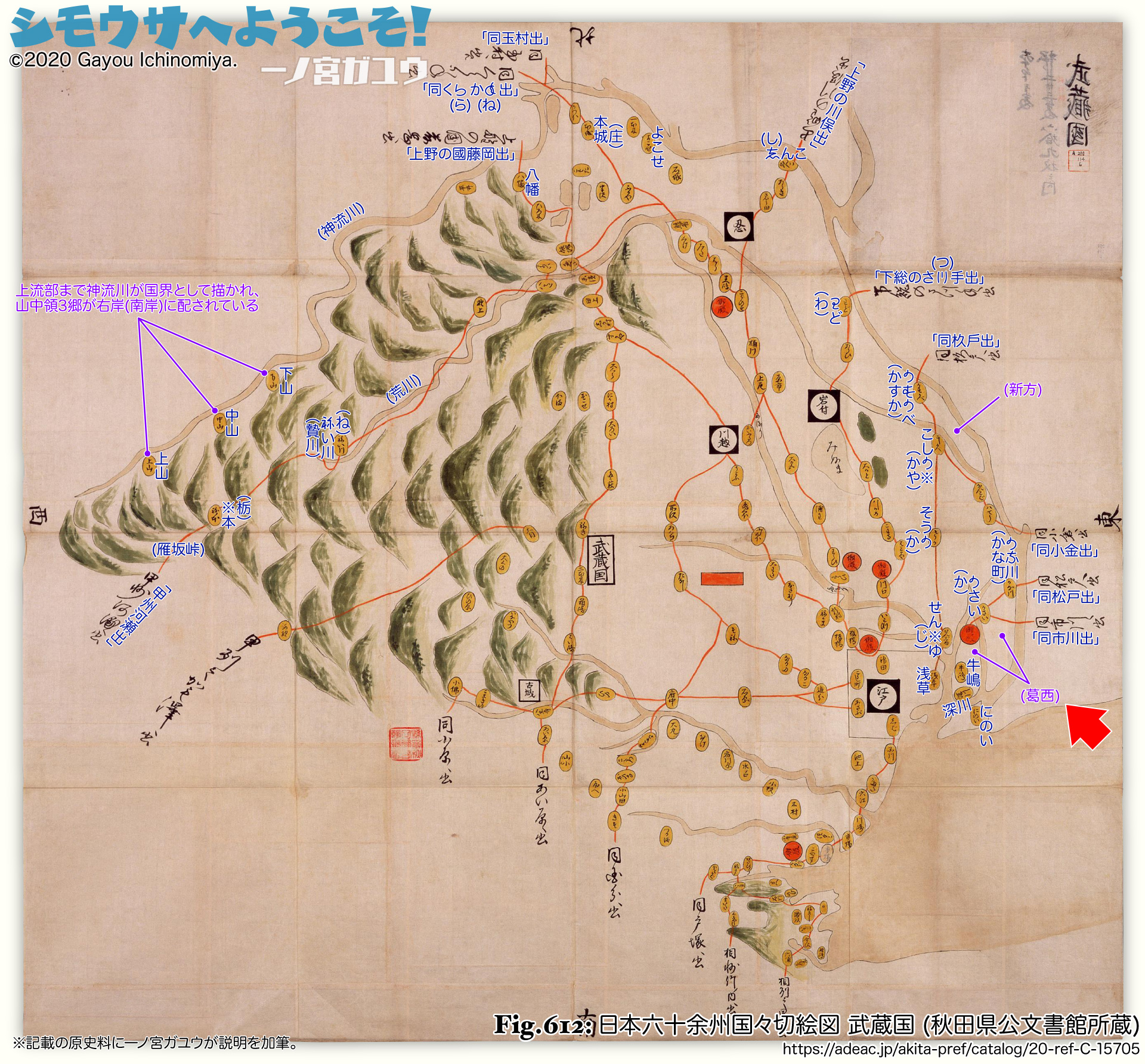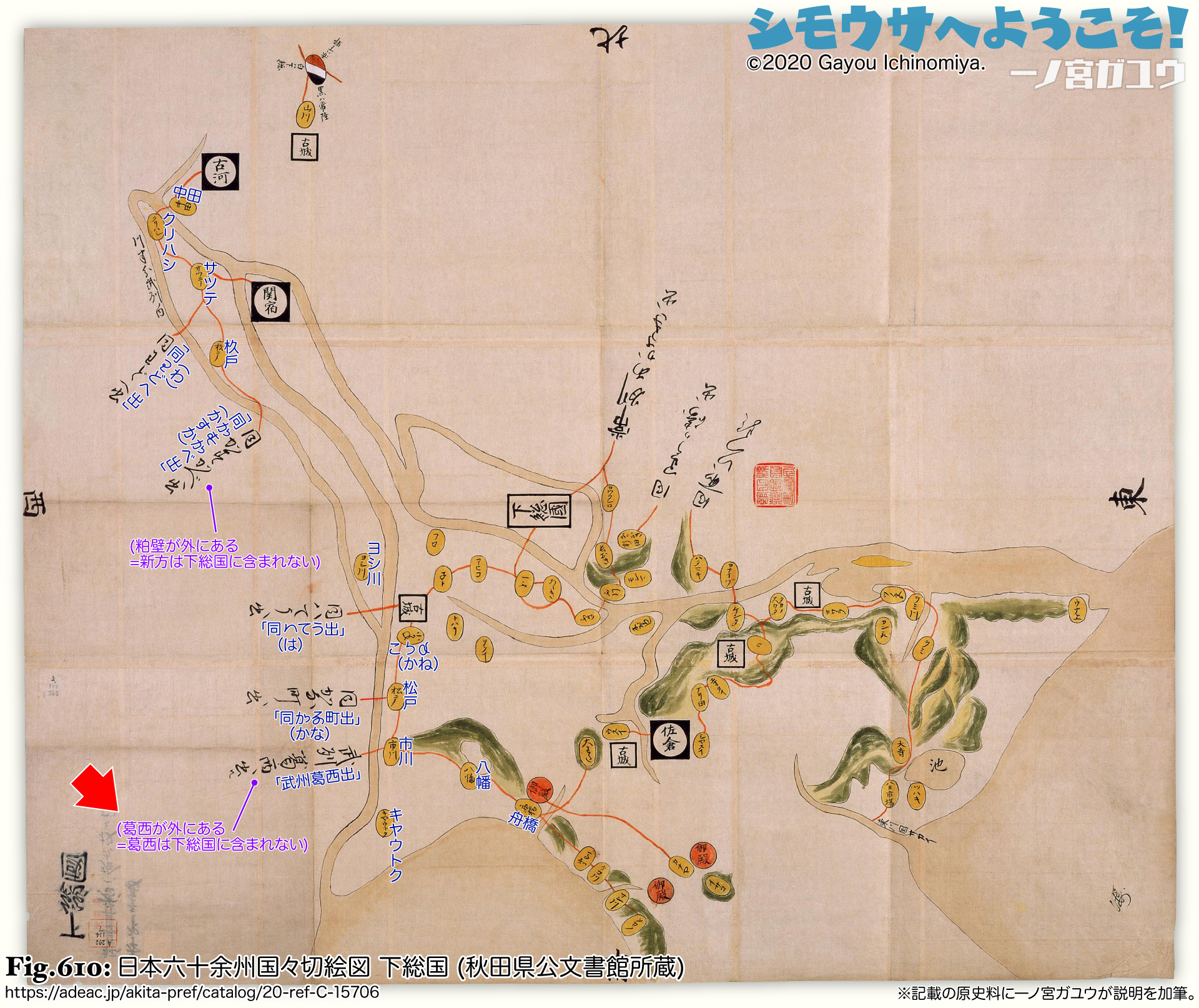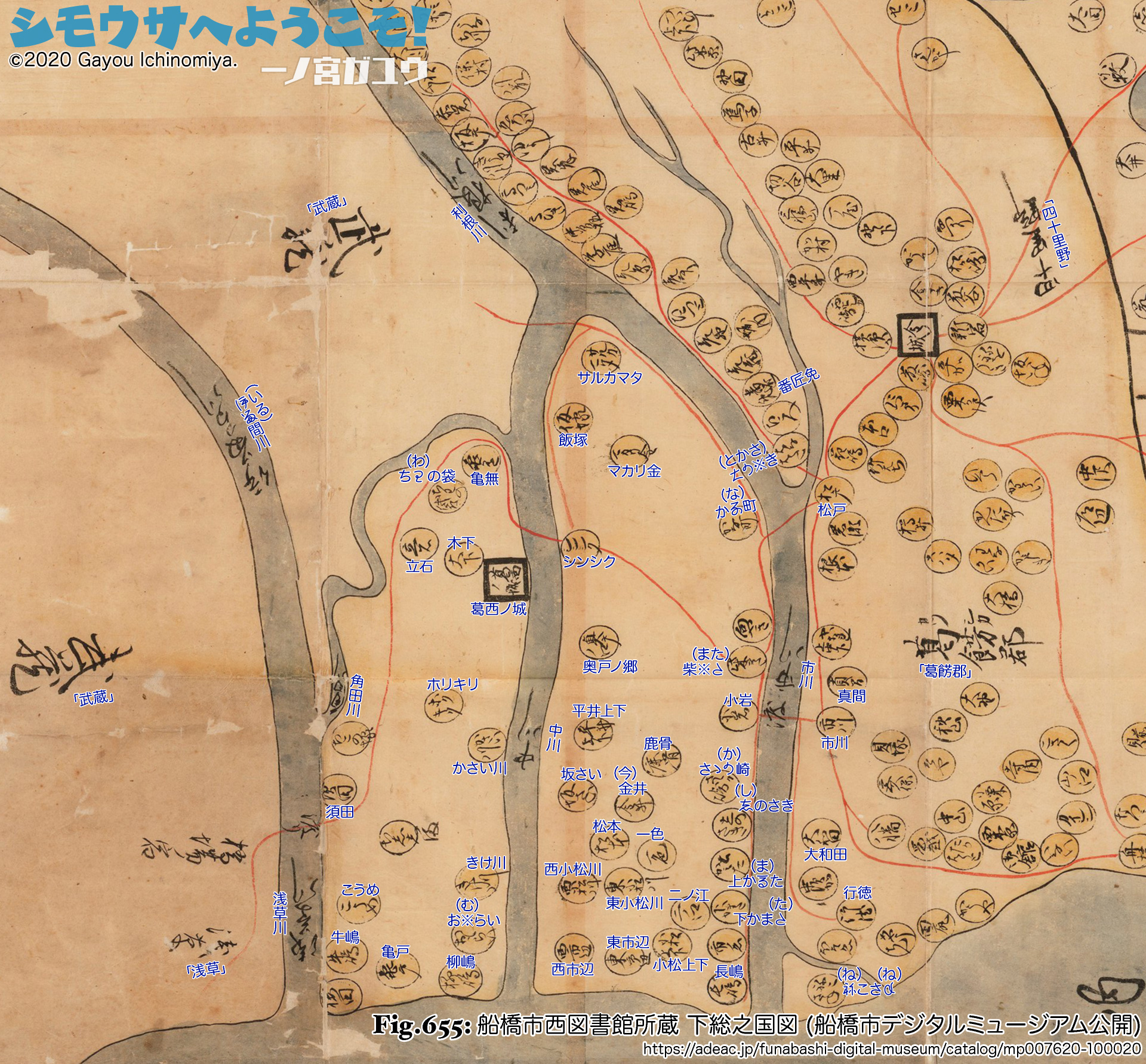 つまり描かれているのは近世の利根川 (現在の江戸川) までであって、葛西地域は下総国の外にある。一方、武蔵国では「同市川出」(同 = 下総) とあるところから佐倉街道がはじまり、「𛀚𛂁川」(かな川、金町)※6から来る水戸街道と合流するところに「𛀚さい」(かさい、葛西) がある。