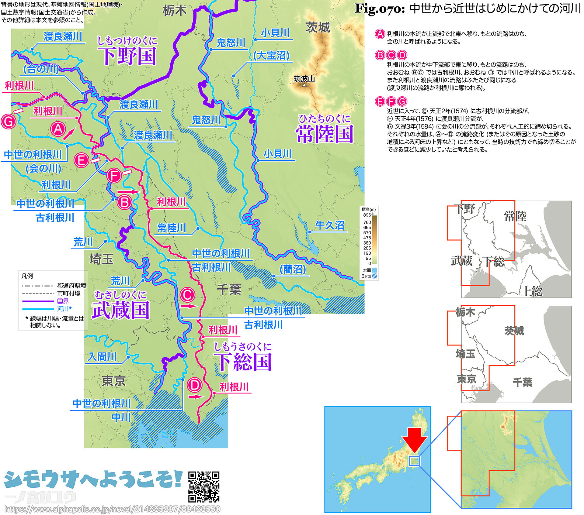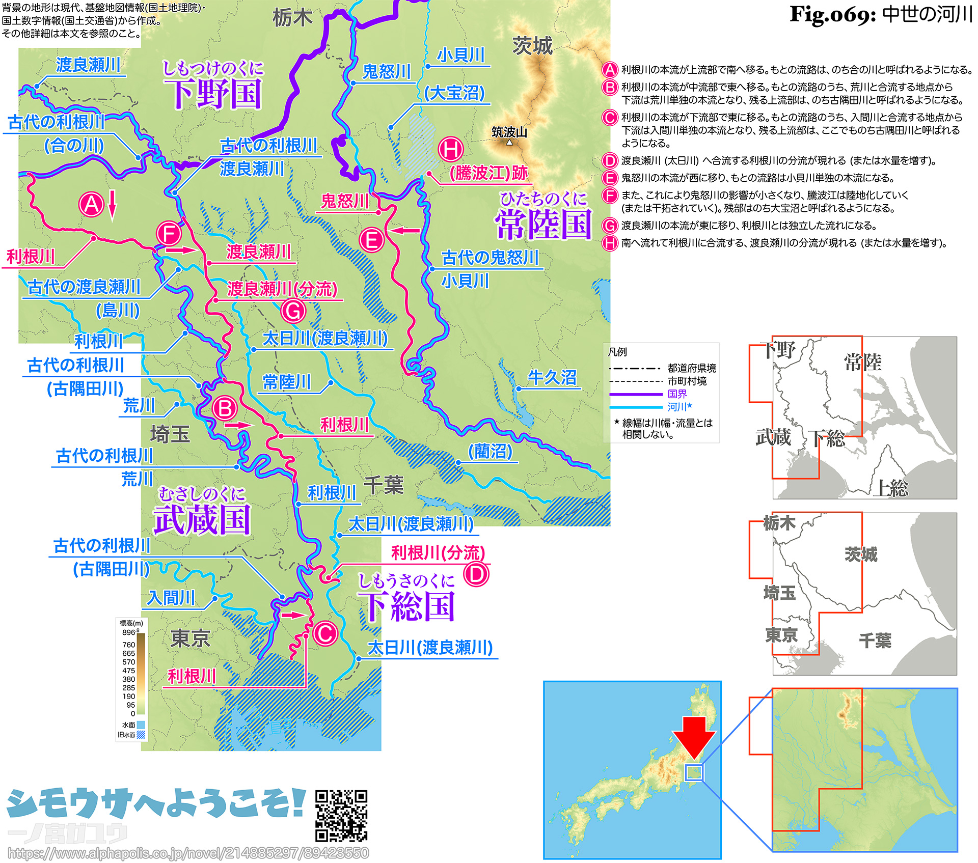下総の国界は、68国が確立した 9世紀はじめ以降、いくつかの変動を経験した。まずこれに関係する河川の変化を追う。以降、河川の流路は本流 (主流・幹流) を示す。上流・中流・下流といった表現は、すべて地図の範囲内で便宜上呼ぶものである。近世における利根川の人工的な流路変更 (いわゆる『利根川の東遷』※1) については、その目的のほか時期や規模についても諸説あるが、ここでは中立的な立場から総論的にまとめている『利根川百年史』(1987)※2によった。