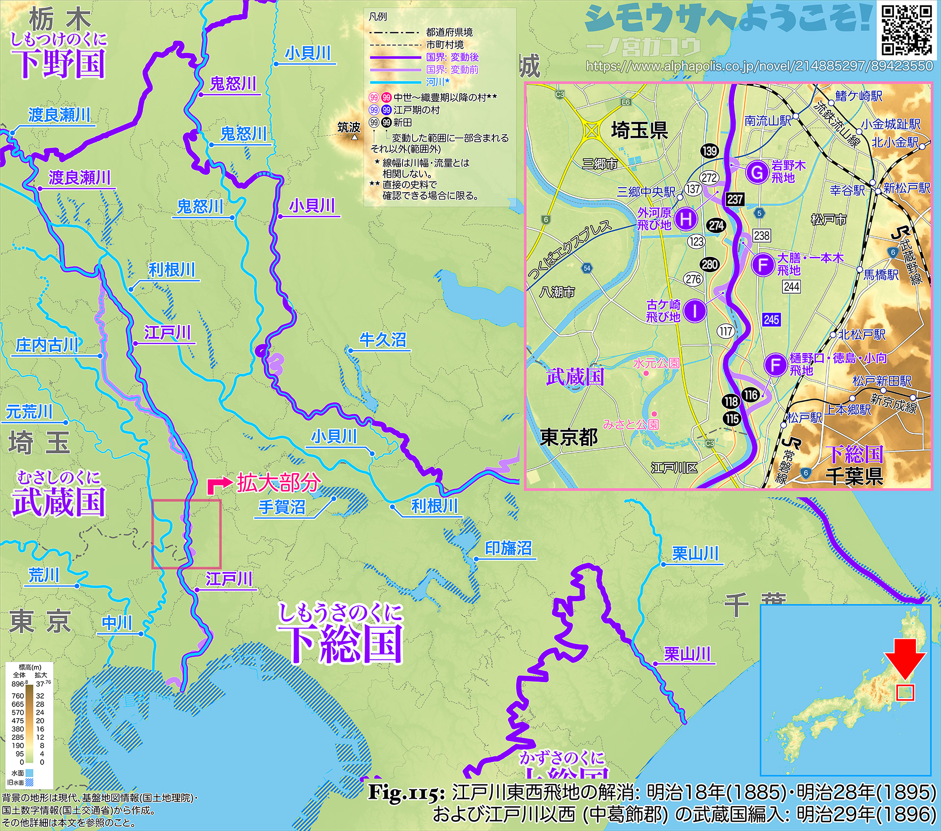 | Ⓕ | 埼玉県 北葛飾郡 八木郷村 大膳・一本木・樋野口・徳島・小向の江戸川以東: 武蔵国 (埼玉県管轄) → 下総国 (千葉県管轄) [明治28年 法律第24号]※31※32 |