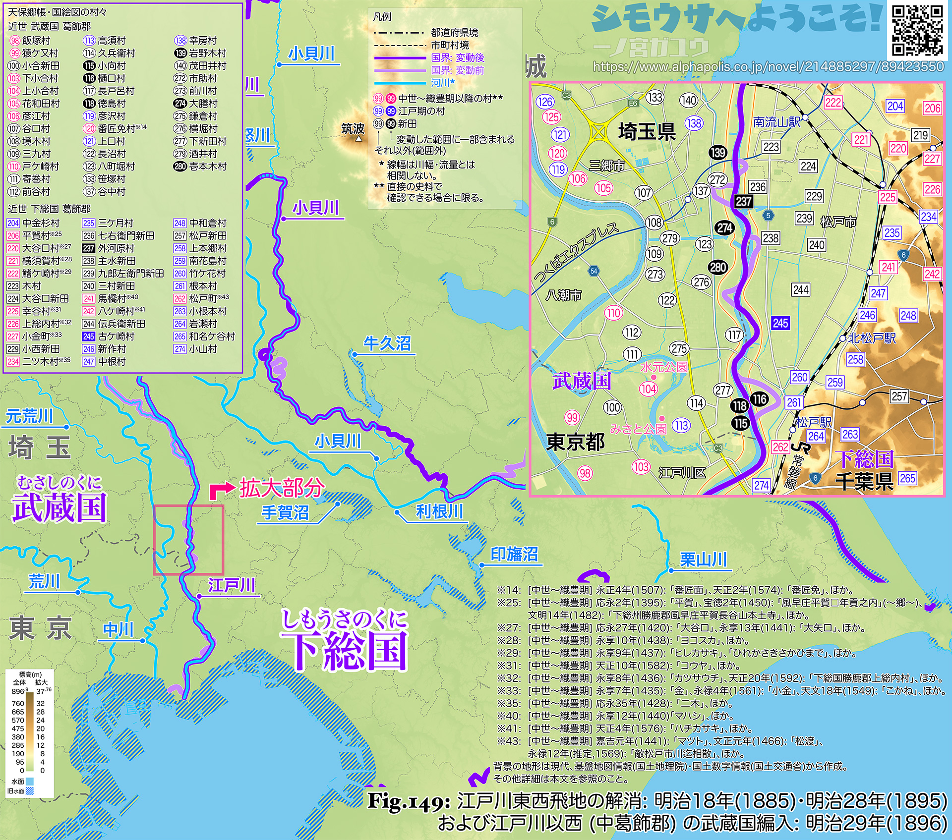 | ❉32: | 法律第24号の上では郡名だけ記載されているが、北葛飾郡は武蔵国、東葛飾郡は下総国である。 |