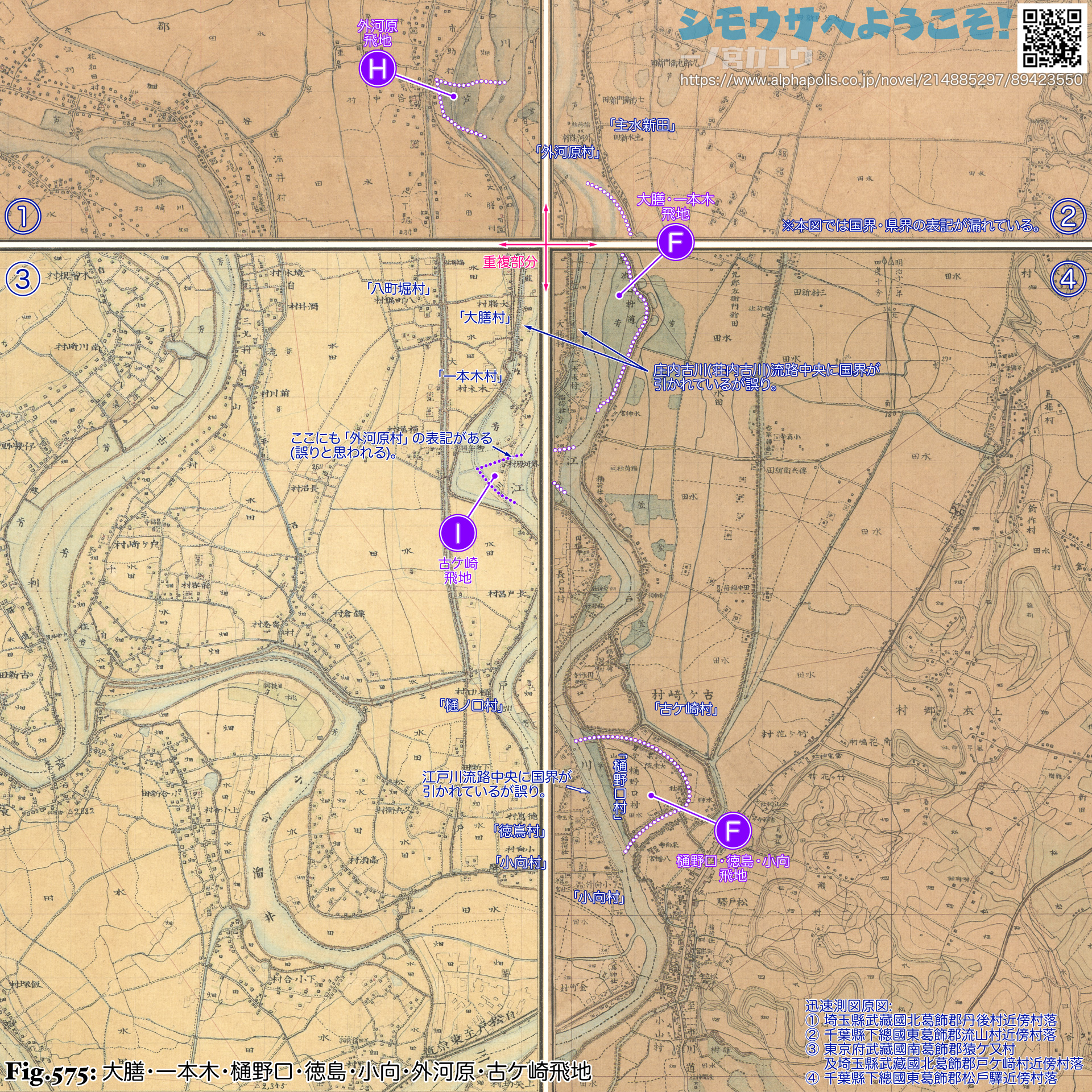 | ❉47: | 原文「千葉縣東葛飾郡明村大字古ケ崎ノ内江戸川以西ハ埼玉縣北葛飾郡八木鄕村ニ編入ス」。 |