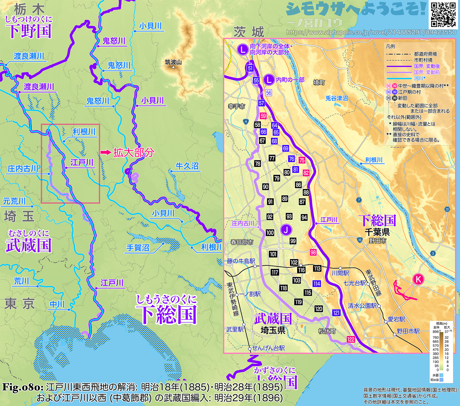 | Ⓙ | 中葛飾郡: 下総国 (埼玉県管轄) → 武蔵国 (埼玉県管轄) [明治29年 法律第40号] |
