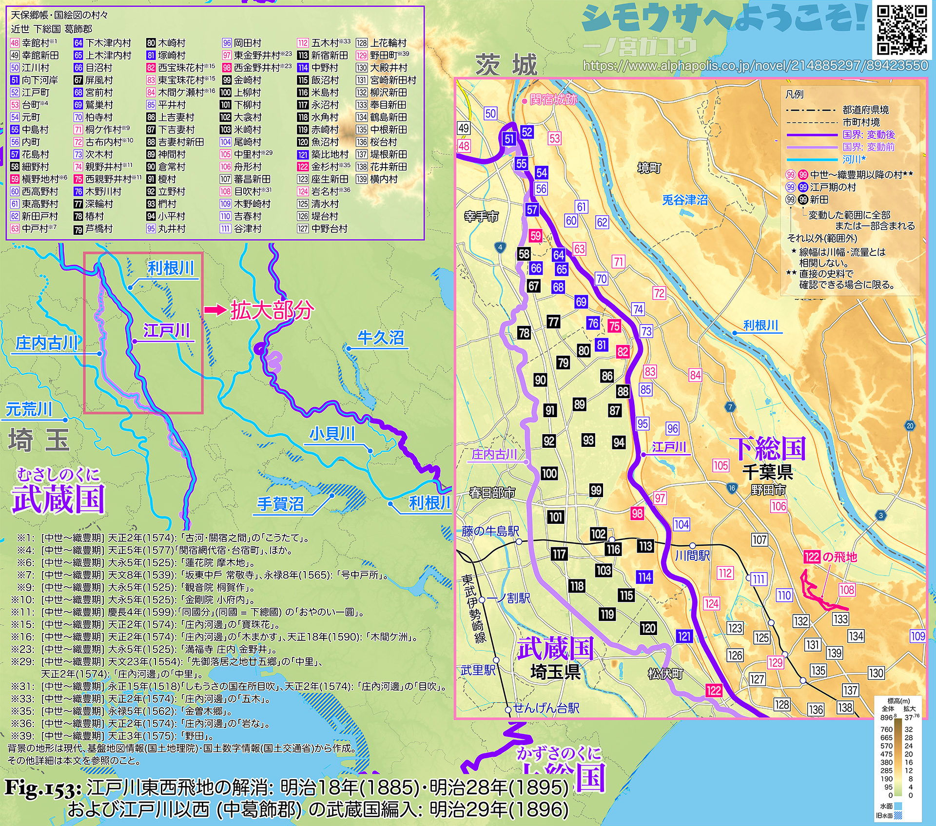 一方でこの結果、下総国 葛飾郡には江戸川によって地理的に分断される部分が生じてしまった。これについて、さしあたり行政面の不便を解消するため、明治8年(1875) 下総国 葛飾郡のうち飛地を除く全体が江戸川以西にある村々の管轄は、それまでの千葉県から埼玉県へ変更された※46。ただし、このとき国郡は下総国 葛飾郡のままであり、変わっていない。