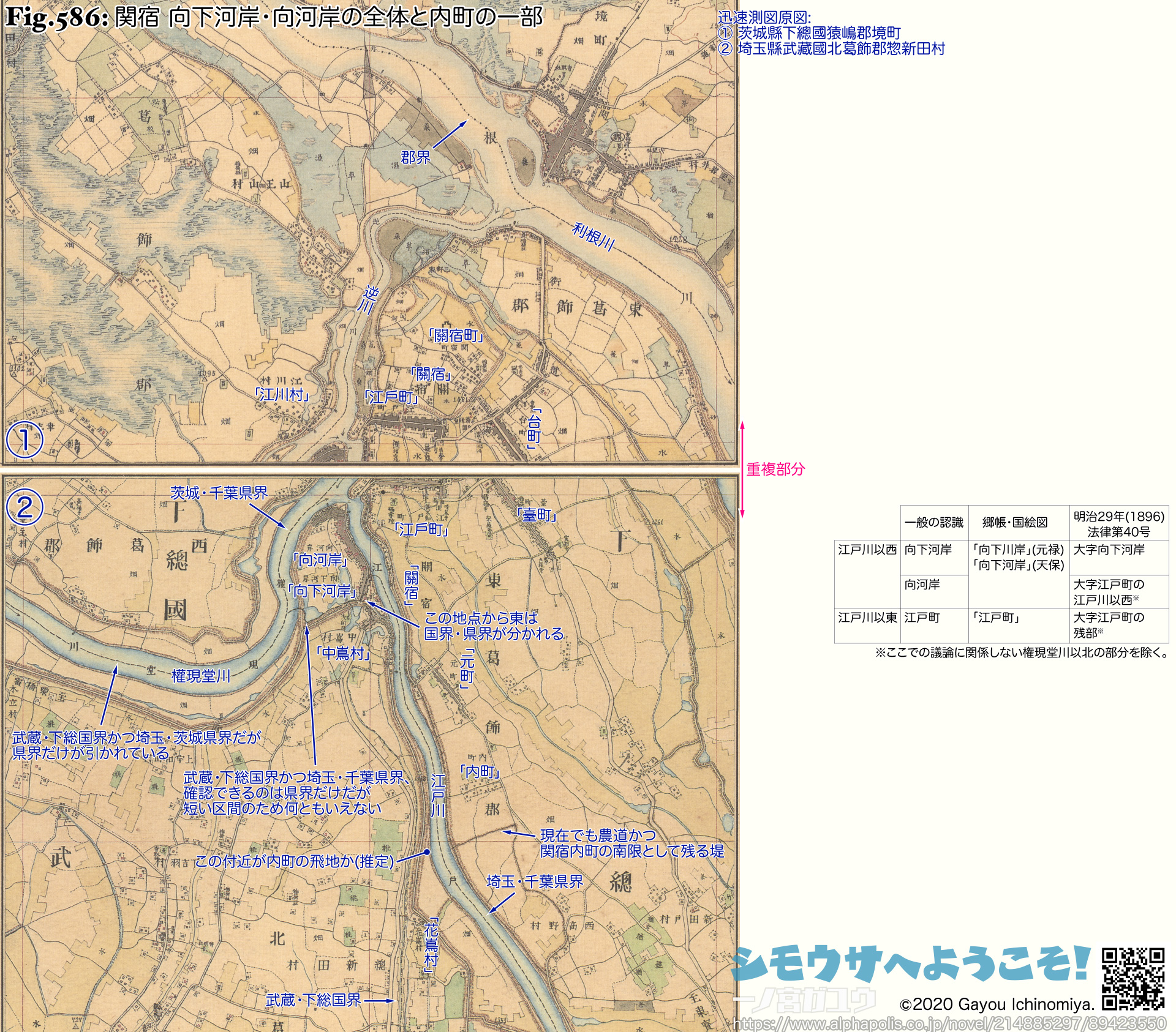 しかし明治28年(1895) 法律第24号には「千葉県 東葛飾郡 関宿町 大字向下河岸、および大字内町・大字江戸町のうち江戸川以西は埼玉県中葛飾郡豊岡村に、大字江戸町のうち権現堂川以北は茨城県西葛飾郡五霞村に編入する」※52とあるので、少なくともこの法令上は「大字江戸町」に江戸川以西 (および権現堂川以北) の部分が含まれたままだった。また向下河岸を区別していることから、向河岸がこれに相当するらしい。