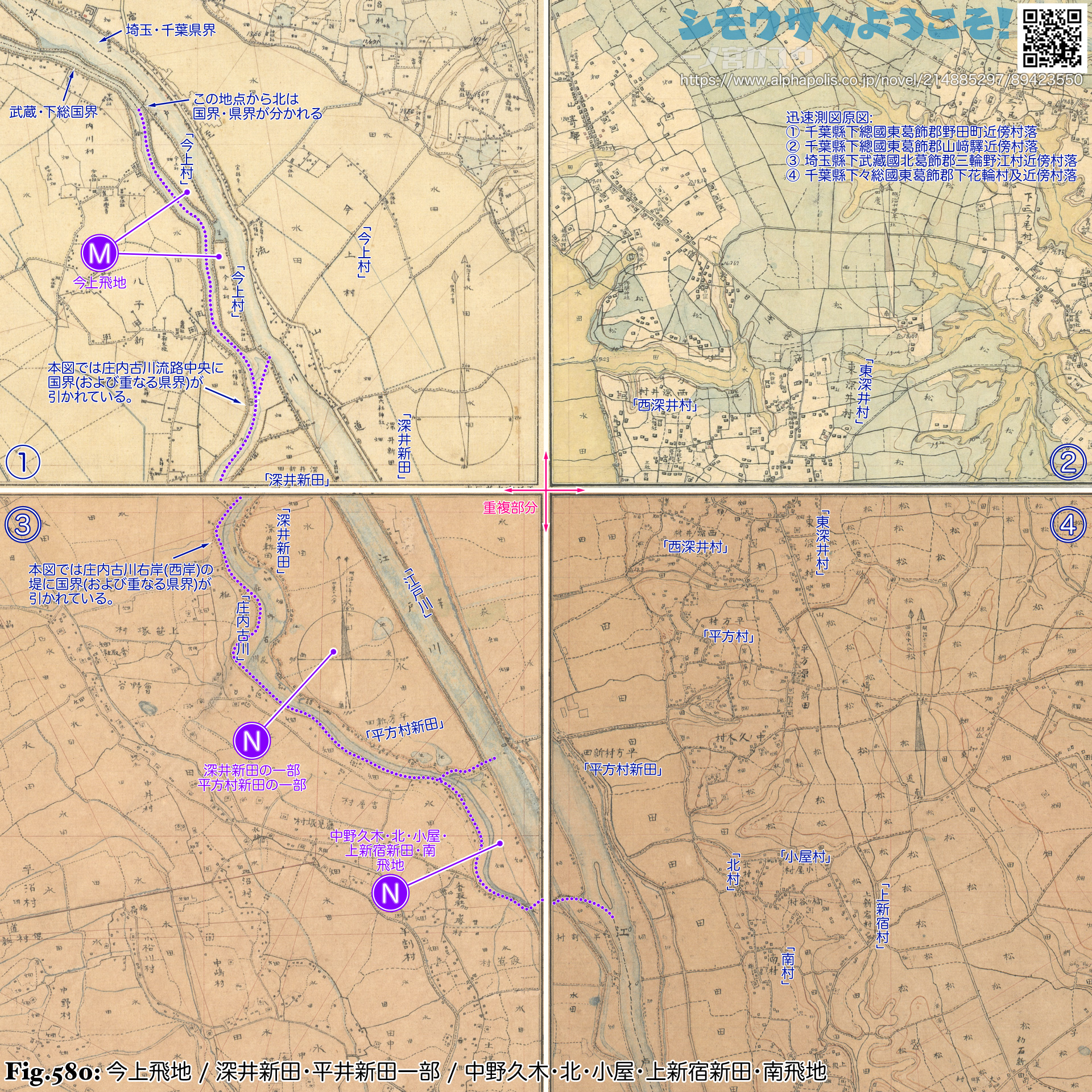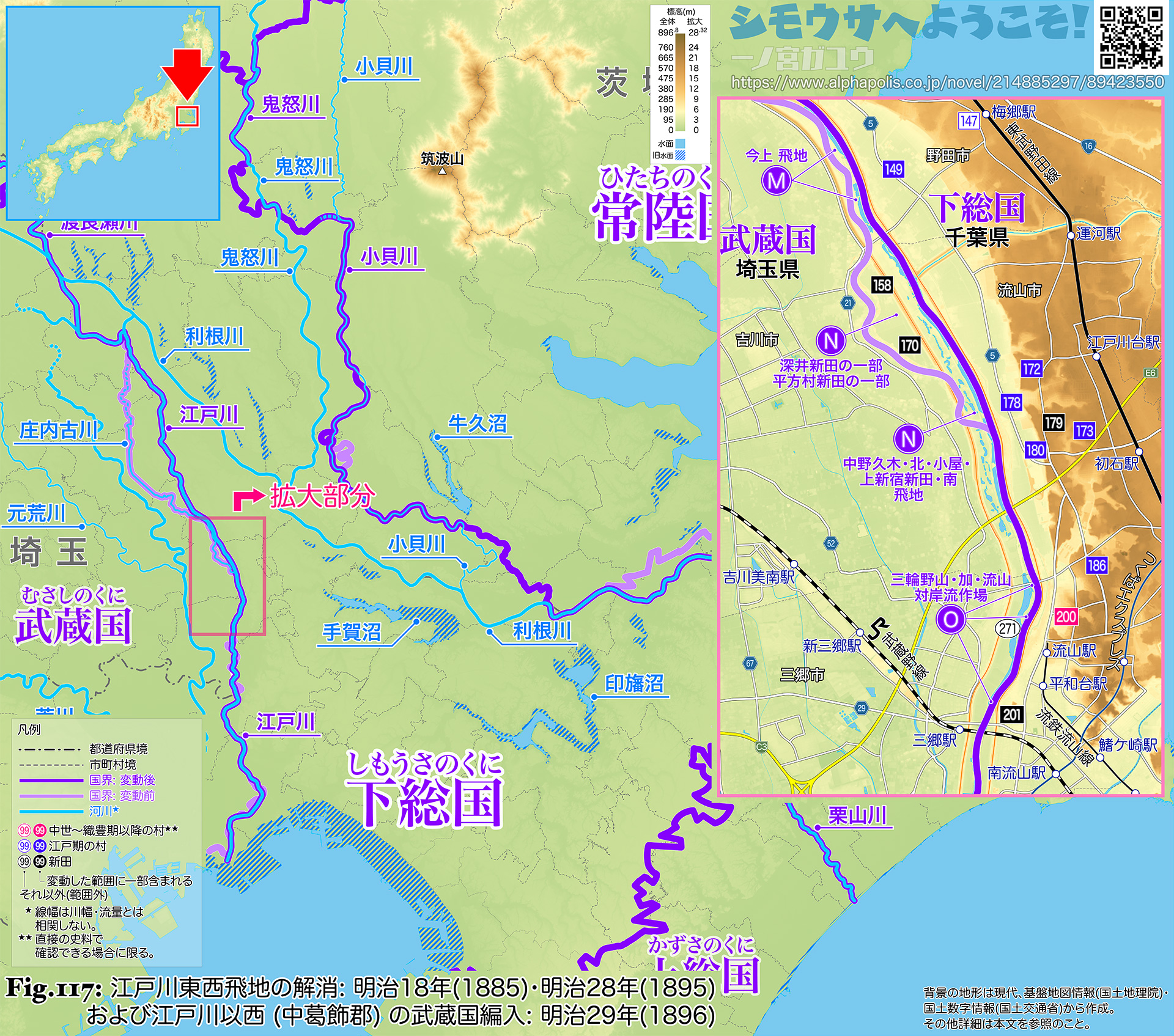 | Ⓝ | 千葉県 東葛飾郡 新川村 深井新田・平方村新田・中野久木・北・小屋・上新宿新田・南の江戸川以西: 下総国 → 武蔵国 [明治28年 法律第24号]※47※46 |