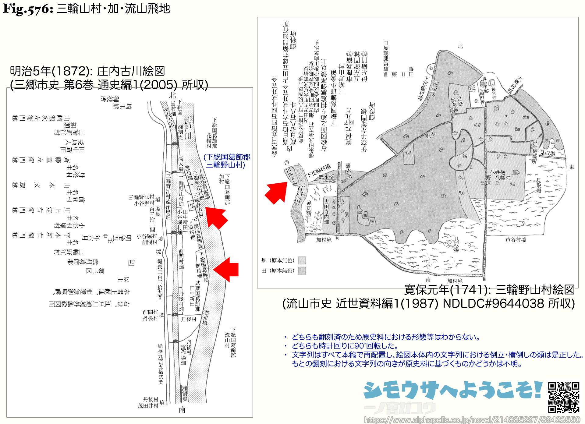 三輪野山村絵図と同じ寛保元年(1741) の加村郷差出帳によれば、「川向」と肩書きされた 4.6ヘクタール (『苅流し』によって残部は 3.2ヘクタール) ほどの「葭谷」という流作場扱いの新田が存在した。流山については情報が得られないが、三輪山・加と事情が異なるとは考えづらい。