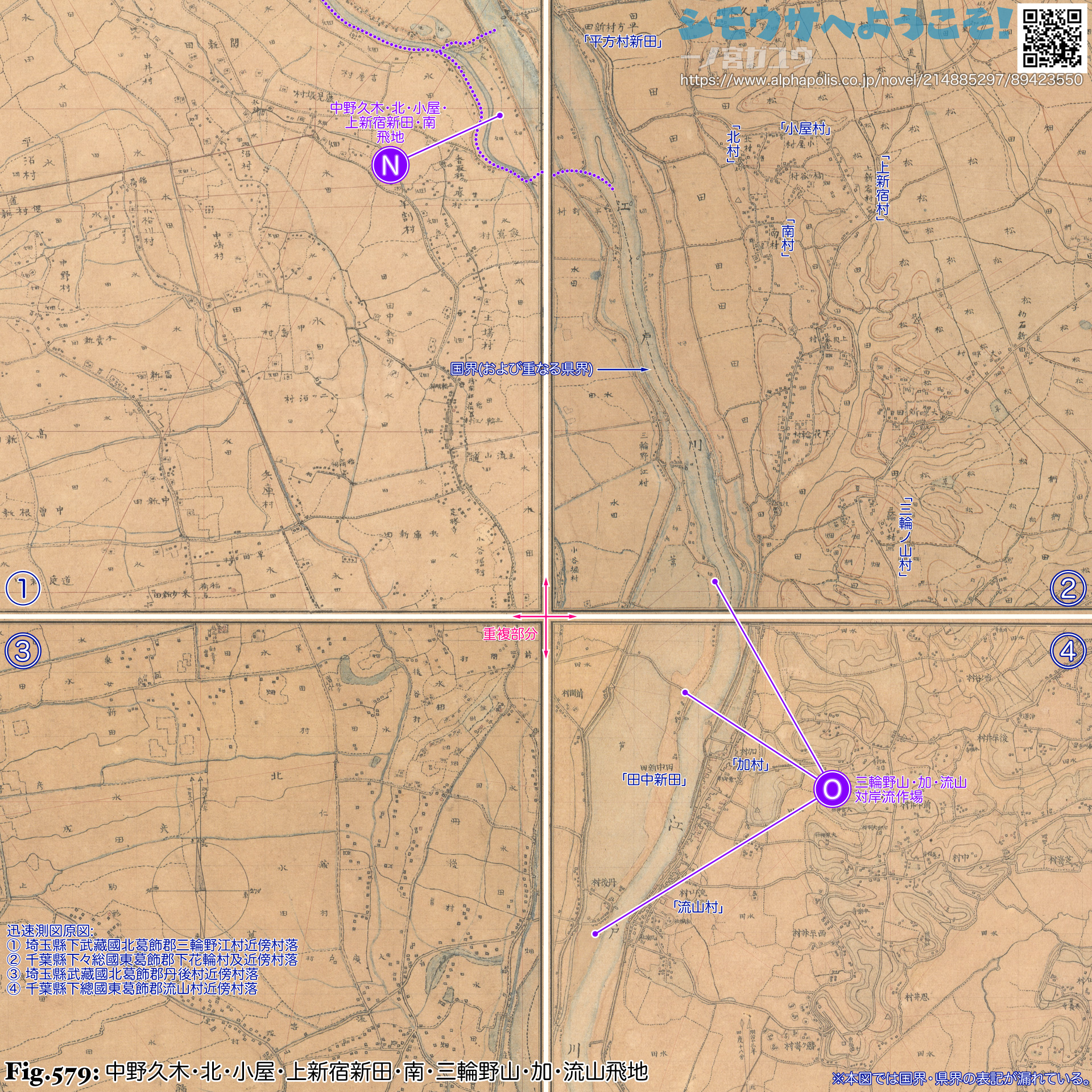 | ❉48: | 原文「千葉縣東葛飾郡流山町大字三輪野山ノ内江戸川以西ハ埼玉縣北葛飾郡三輪野江村ニ大字加ノ内大字流山ノ内江戸川以西ハ埼玉縣北葛飾郡早稻田村ニ編入ス」。 |