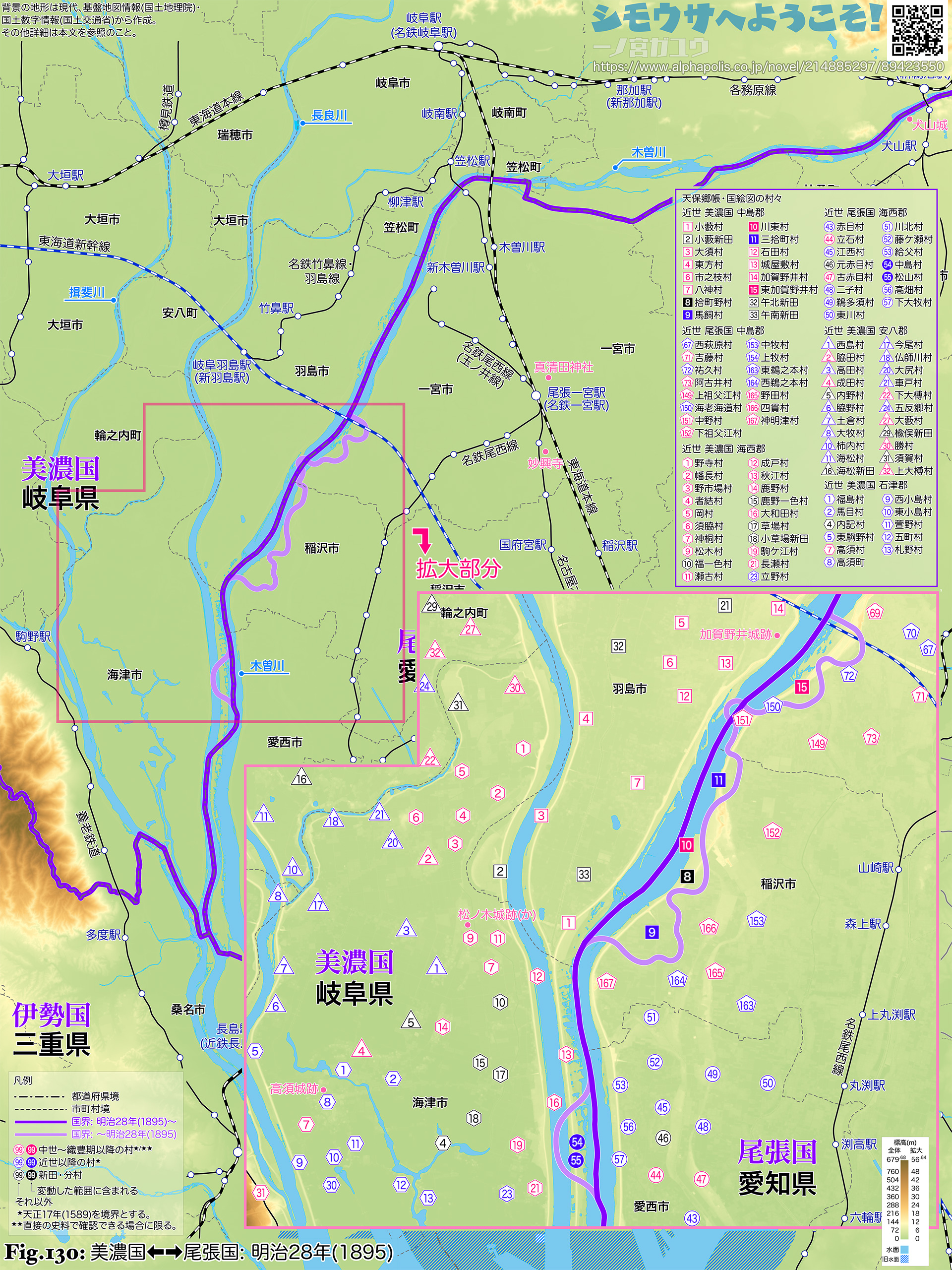 | ❉7: | 原文「愛知縣下尾張國海西郡松山中島村ヲ美濃國海西郡ヘ組替岐阜縣管轄トシ岐阜縣下美濃國中島郡東加賀野井村三拾町村拾町野村馬飼村ノ四箇村ヲ尾張國中島郡ヘ組替愛知縣管轄トス」。 |
