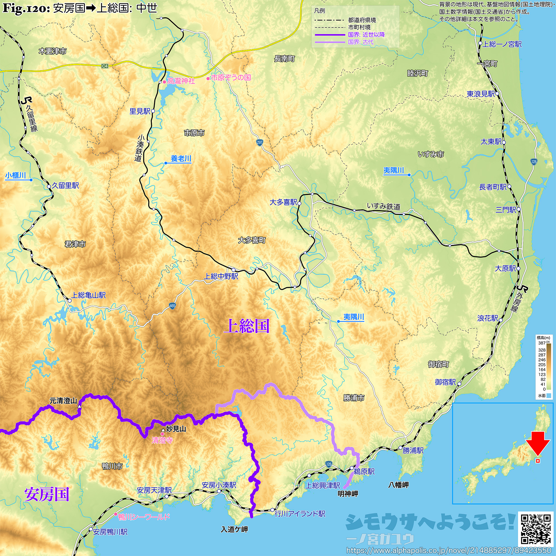 | ❉1: | [中世〜織豊期] 天正8年(推定, 1580): 「興津巢城」(妙本寺文書、改訂房総叢書 第1輯,1959)。直接的な国郡・広域地名の記載は見当たらない。 |