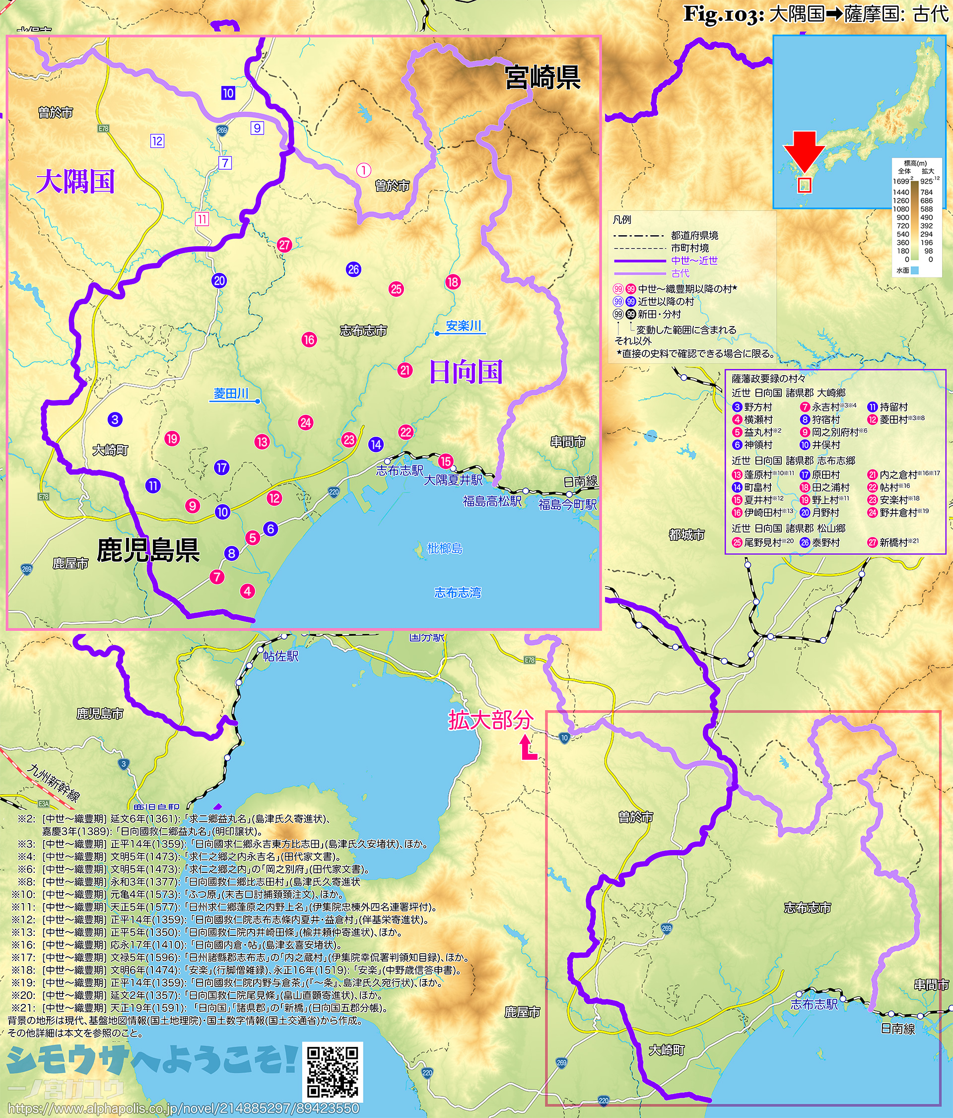 | ❉8: | [中世〜織豊期] 永和3年(1377): 「日向國救仁郷比志田村」(島津氏久寄進状、鹿児島県史料 旧記雑録前編2,1980)、ほか。 |