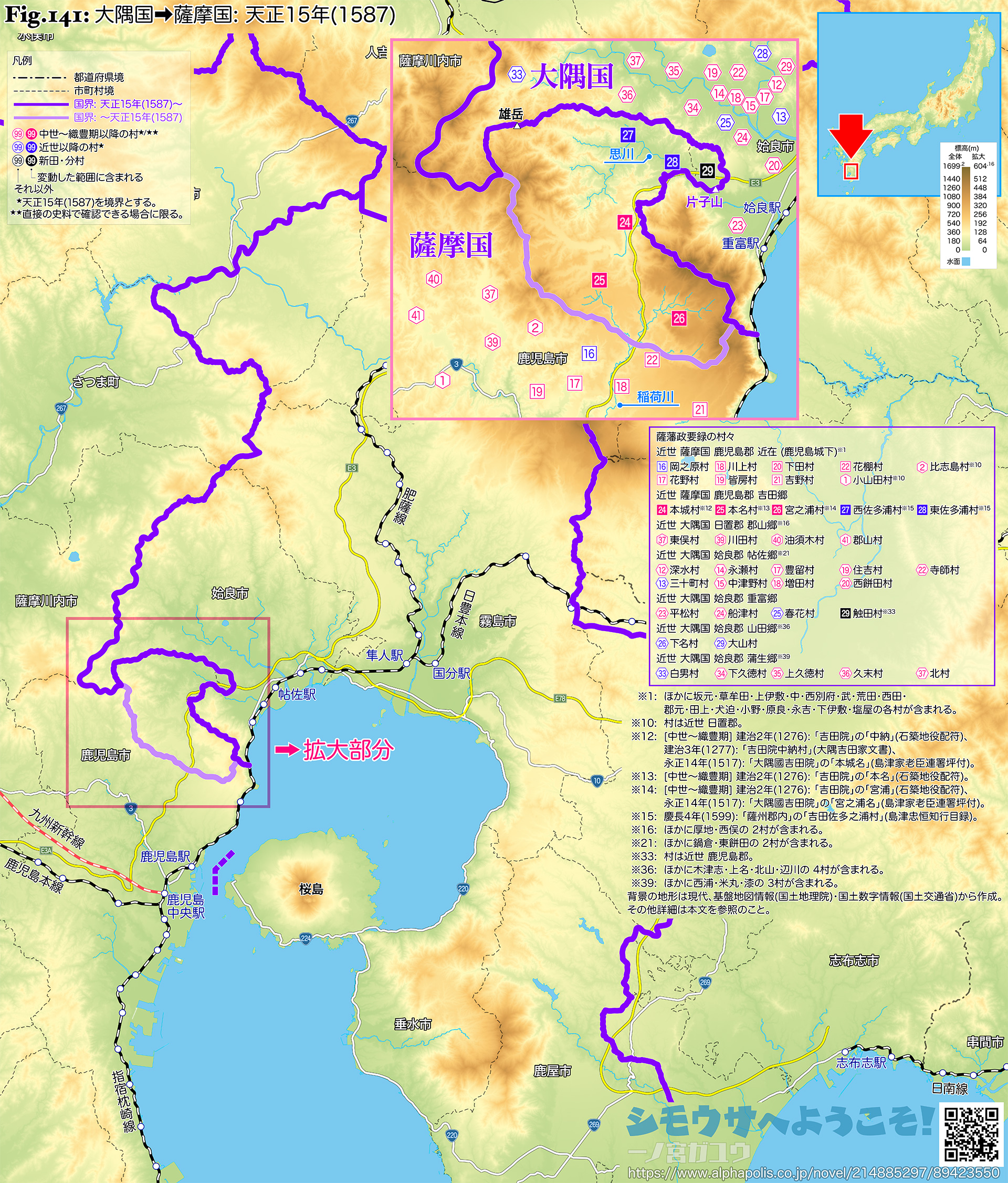 | ❉36: | 『鹿児島県史料 旧記雑録 後編2』(1982) 所収 天正15年(1587) 5月9日付『豊臣秀吉判物』(義久宛)・5月25日付『豊臣秀吉朱印状』(義弘宛)、および『豊臣政権下における九州再国分について』(1983, 桑田, 九州史学 第78号)。 |