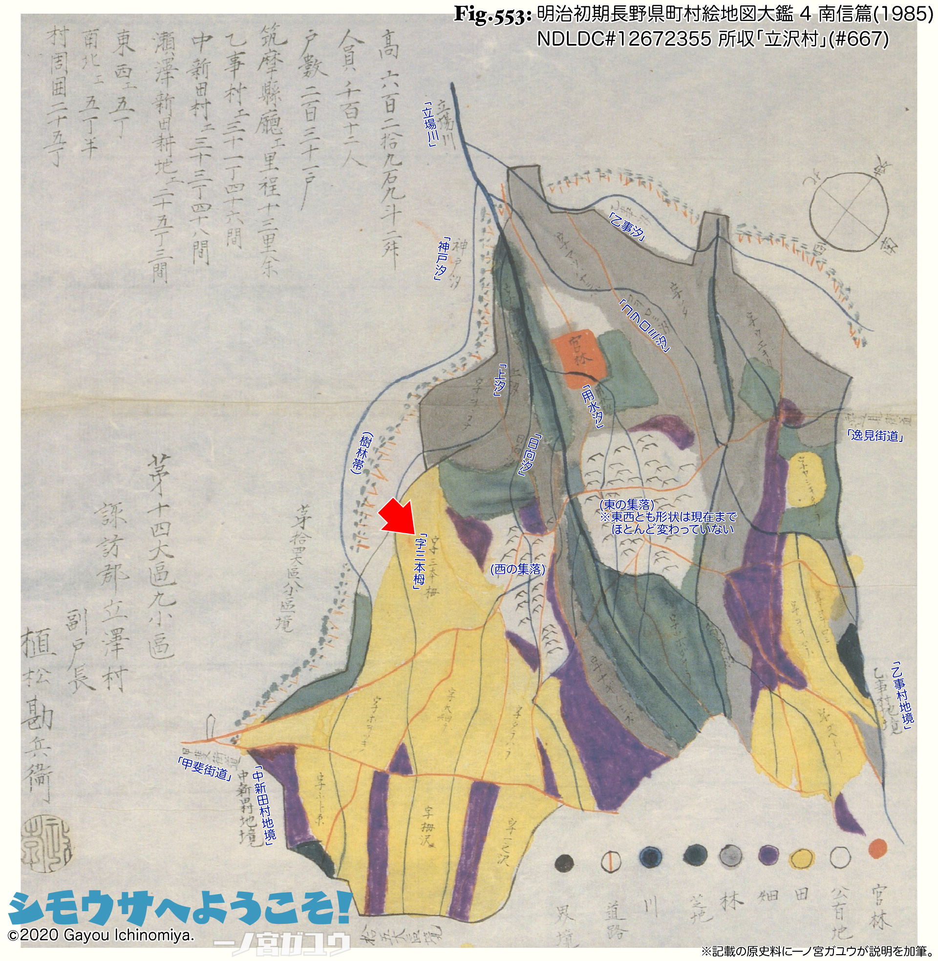 『富士見町史 上巻』(1991) で略図上に相当する位置が示され、郡村誌付帯の立沢村絵図にも同じような位置に「字三本栂」がある。