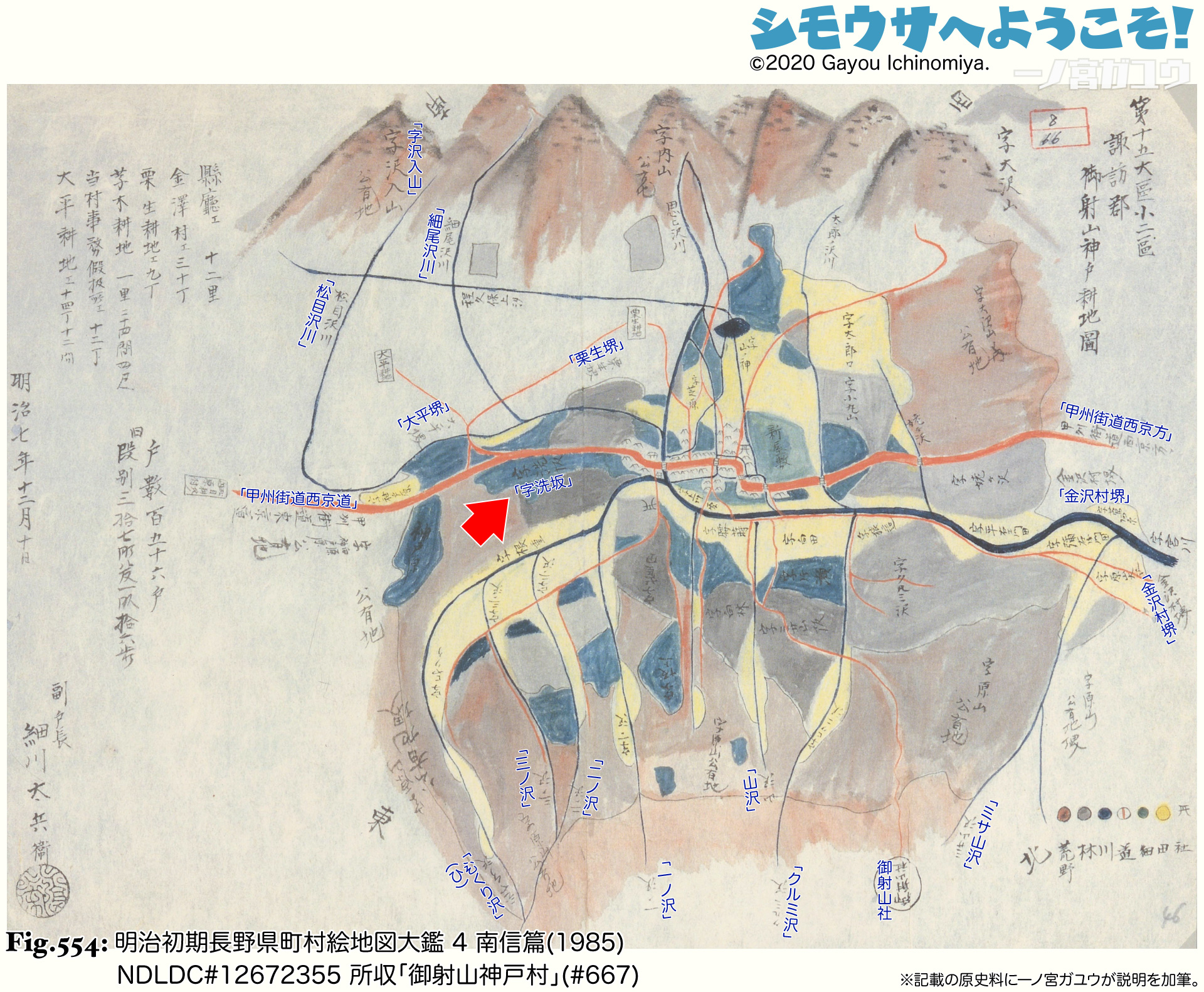 郡村誌付帯の御射山神戸村絵図にもその付近の甲州街道脇に「字洗坂」という地名がある。