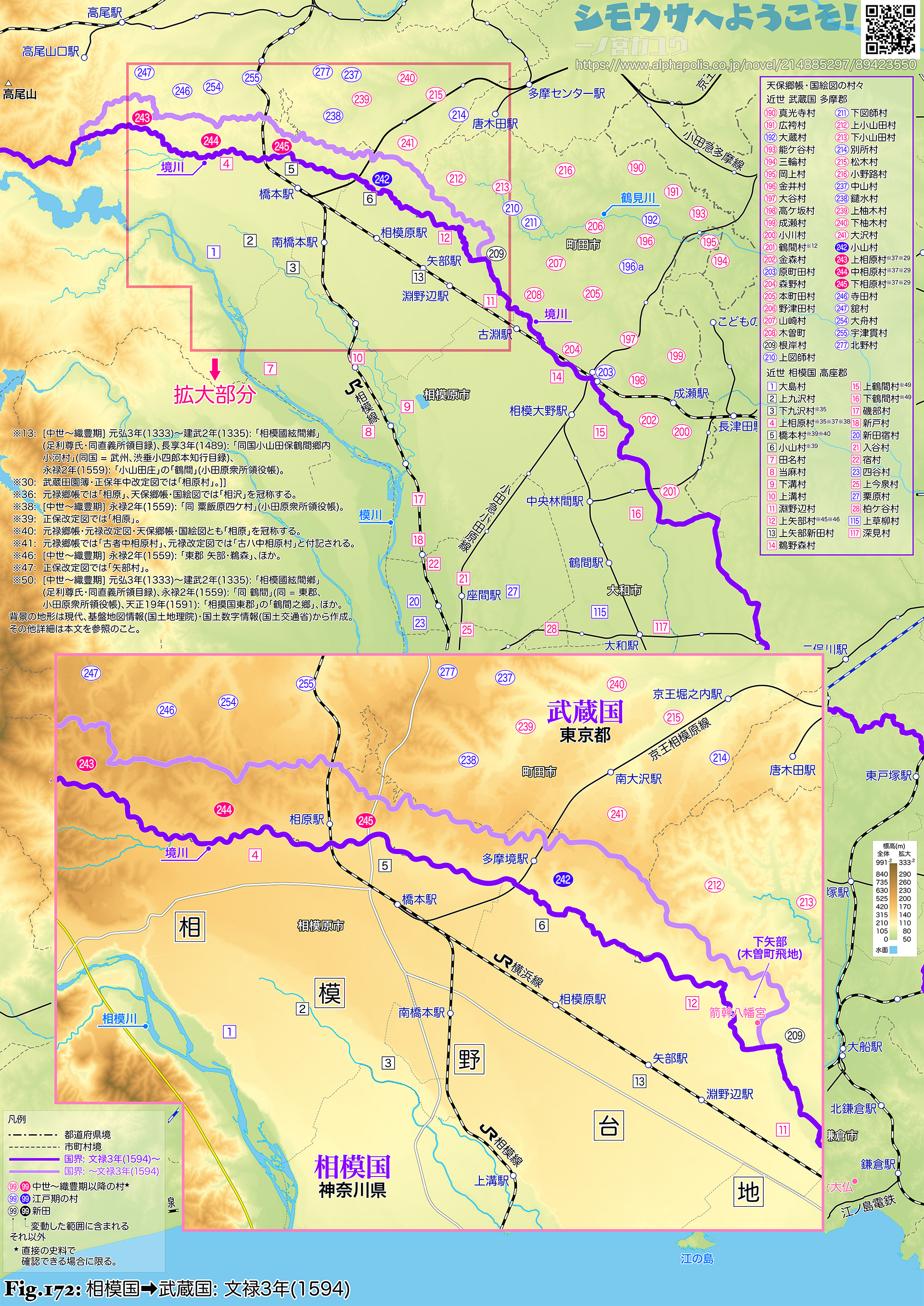 | ❉13: | [中世〜織豊期] 元弘3年(1333)〜建武2年(1335): 「相模國絃間鄕」(足利尊氏・同直義所領目録、神奈川県史 資料編3 古代・中世3上,1975)、長享3年(1489): 「同国小山田保鶴間郷内小河村」(同国 = 武州、渋垂小四郎本知行目録、坂戸市史 中世史料編1,1986)、永禄2年(1559): 「小山田庄」の「鶴間」(小田原衆所領役帳)。 |