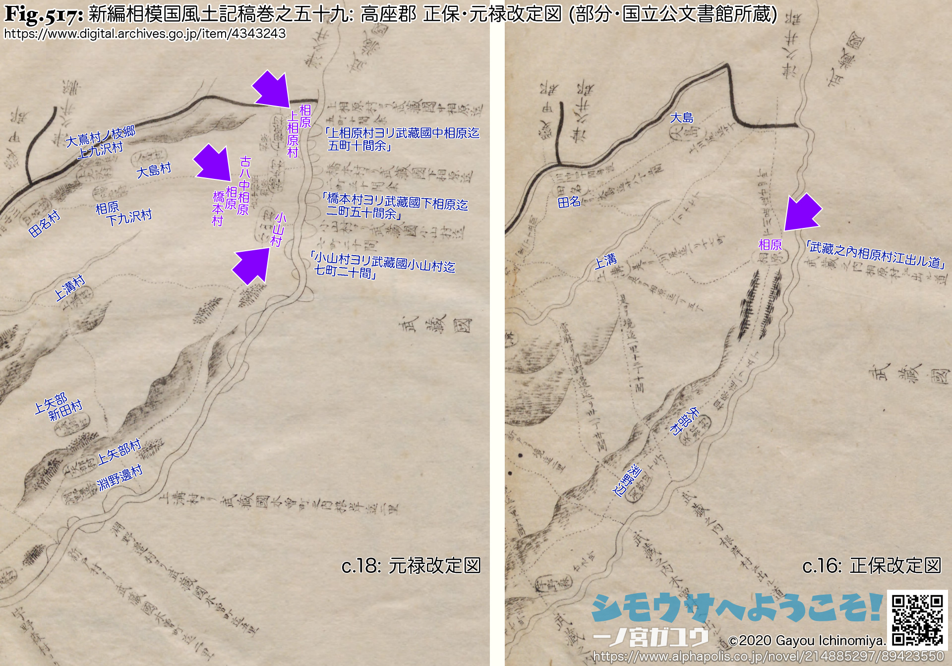 とあり (句読点・中黒は筆者が補った)、橋本村にも「元祿ノ改ニ相原橋本村、古ハ下相原村と傍記ス」とある。しかし比較している武蔵国 多摩郡 相原村の分村は経緯が異なるほか、橋本村が下相原村である場合、下九沢村か小山村が中相原村となるが、どちらにせよ位置と上中下の順番が整合しない。
