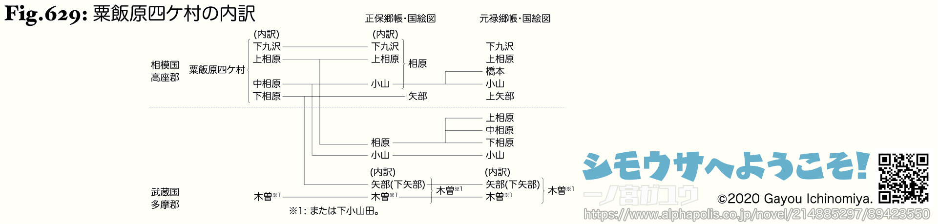 小田原衆所領役帳の「粟飯原四ケ村」の内訳は、上相原・中相原 (橋本・小山)・下相原 (矢部)・下九沢の 4村であり、下九沢村のみ国界の変遷に関係しない。整理すると以下のとおり。