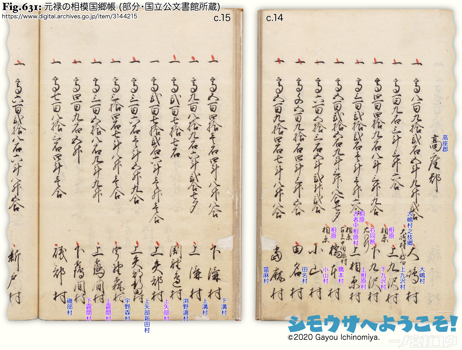 天保の武蔵国郷帳の高座郡は c.25の左ページからはじまっているが、このページと裏面 (c.26の右ページ) を含む紙と、直前の c.24の左ページと c.25の右ページからなる紙が入れ替わったまま綴じられている。このため読む順番はc.25の左ページ → c.26の右ページ → c.24の左ページ → c.25の右ページ → c.26の左ページとなり、以降はそのままである。