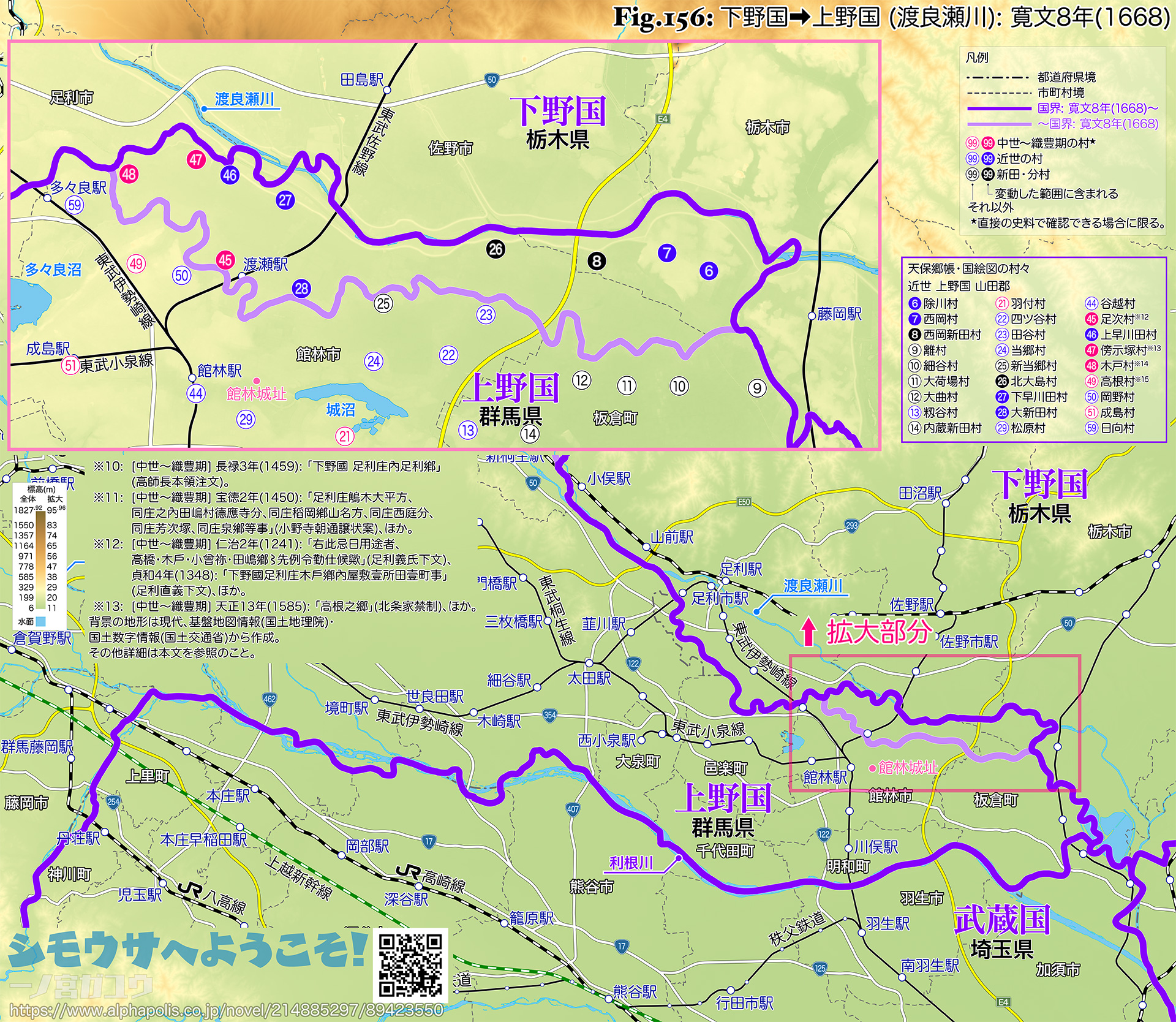 したがって各村は寛文8年(1668) 以後、上野国に移されたことがわかる。なお、正保の下野国郷帳 (東野地誌)・国絵図 (中川忠英旧蔵) のどちらにも含まれない北大島村・大新田村はその後に成立したといえる。
