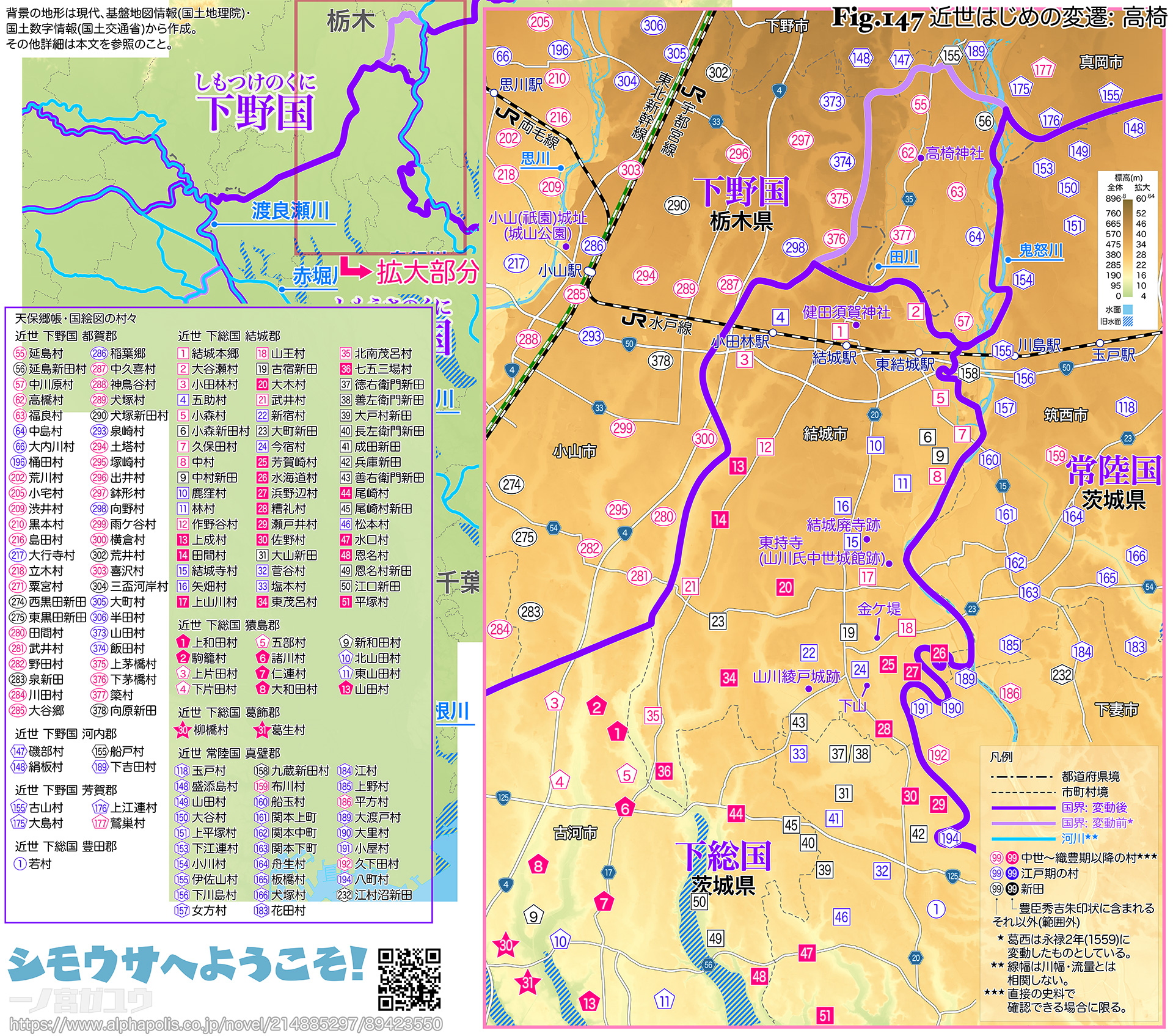 | ❉74: | 明治19年(1886) 結城町に編入、したがって、対応する近代の大字は存在しない。 |