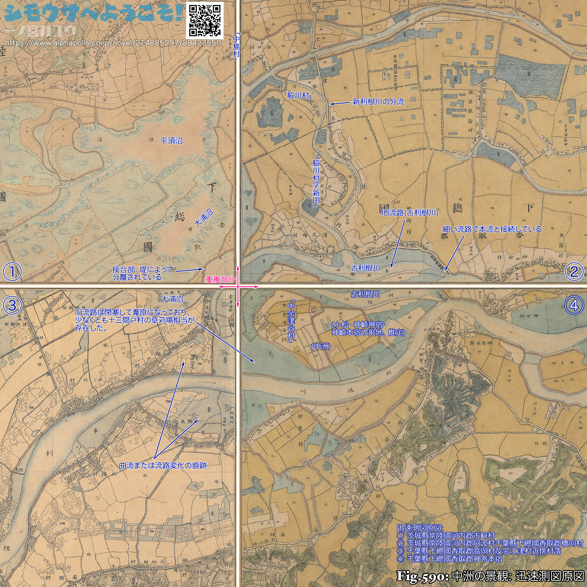 香取郡 四谷村 (現在の稲敷市 余津谷) は中洲にあった。元禄国絵図では北側の流路が本流である一方、天保国絵図では南の流路が本流であって北の流路は途切れている。