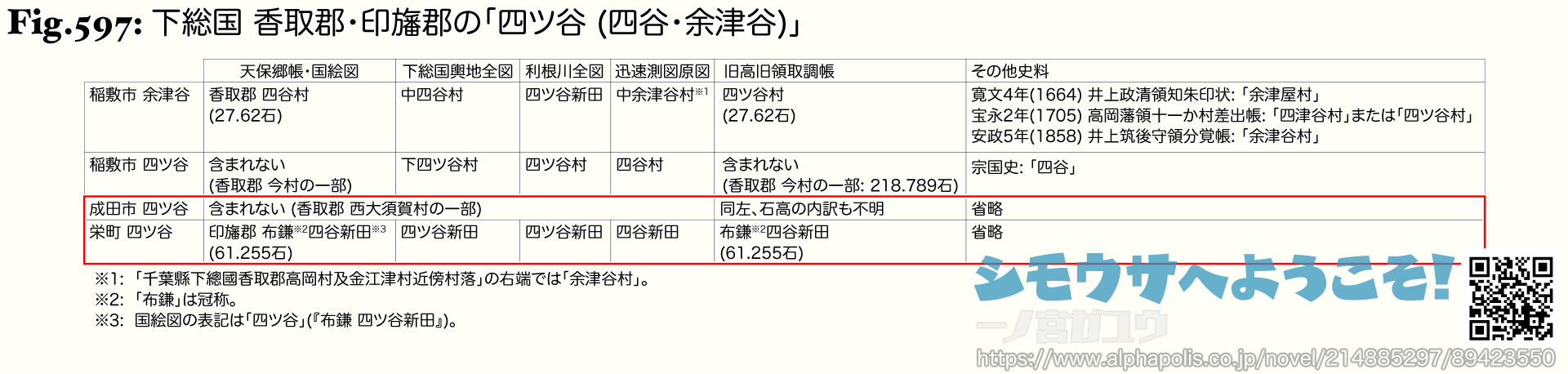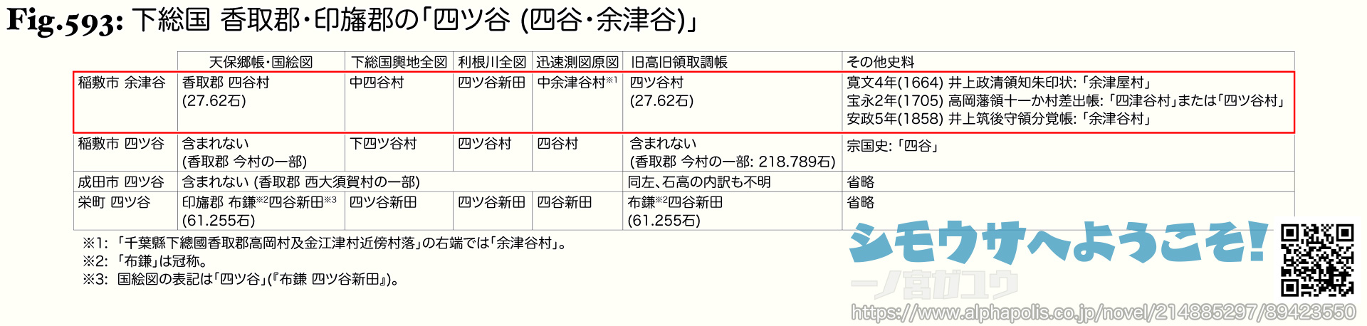 香取郡の四谷村 (稲敷市 余津谷) が中余津谷村 (迅速測図原図)・中四谷村 (下総国輿地全図)、今村の一部である四谷 (稲敷市 四ツ谷) が下四ツ谷村 (下総国輿地全図) とあるのは、このどちらかに対する呼称なのかもしれない。